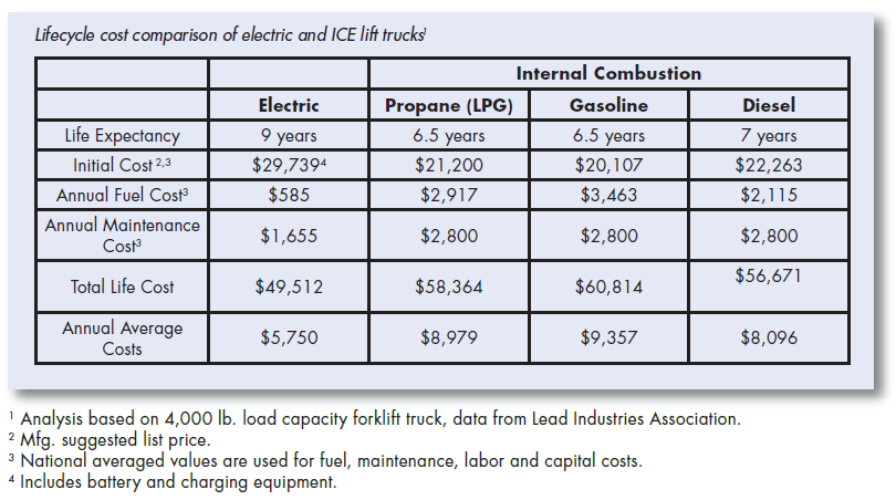 While electric forklifts have higher initial costs than internal combustion (IC) trucks, they have lower maintenance and much lower fuel costs, which substantially reduces the lifecycle costs of electric trucks.