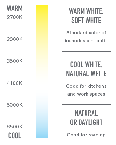 Light color is measured on the Kelvin (K) temperature scale. A lower Kelvin number means a more yellowish light, while a higher Kelvin number means the light is white to blue.